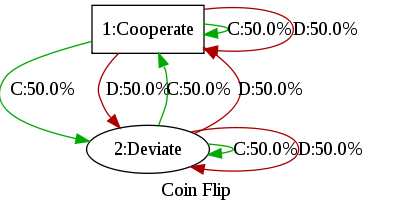 This page allows you to create an entrant for the iterated prisoner's dilemma. Design a state machine and enter its parameters here. The output can be used in an Axelrod type tournament.