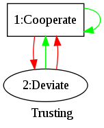 The red arrows indicate what happens when the opponent deviates and the green arrows show the action on cooperate. The first state is rectangular.